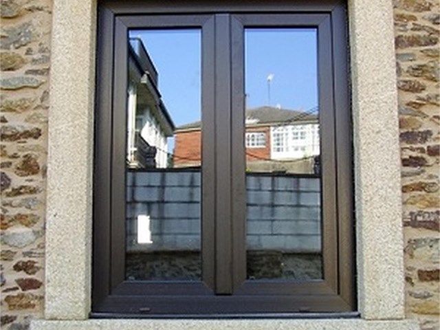 Ventana tradicional fabricada en un color que resalta la estética, colocada sobre mampostería de tonos claros.