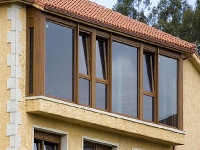 Galería imitación madera combinando distintos tamaños de vidrios para buscar una buena ventilación y la mejor luminosidad interior.